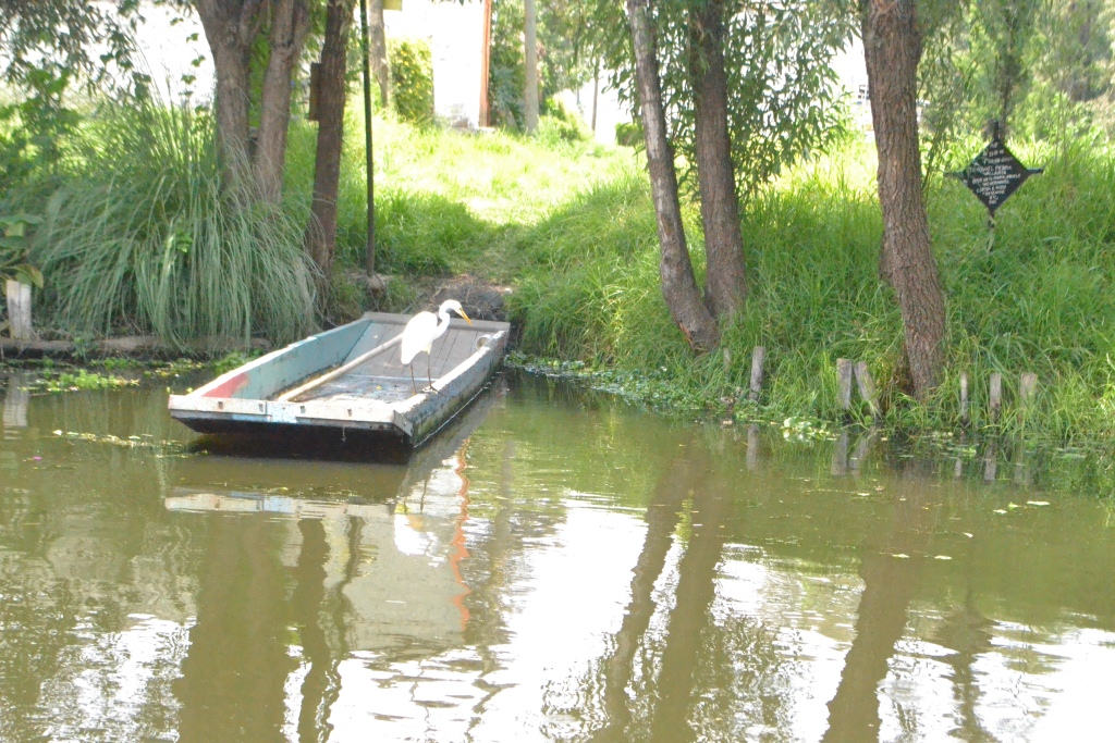 Las aguas de Xochimilco son oscuras y profundas, en ellas hay muchos lirios. Es posible encontrar algunos patos aquí y ese día vimos una hermosa garza blanca.