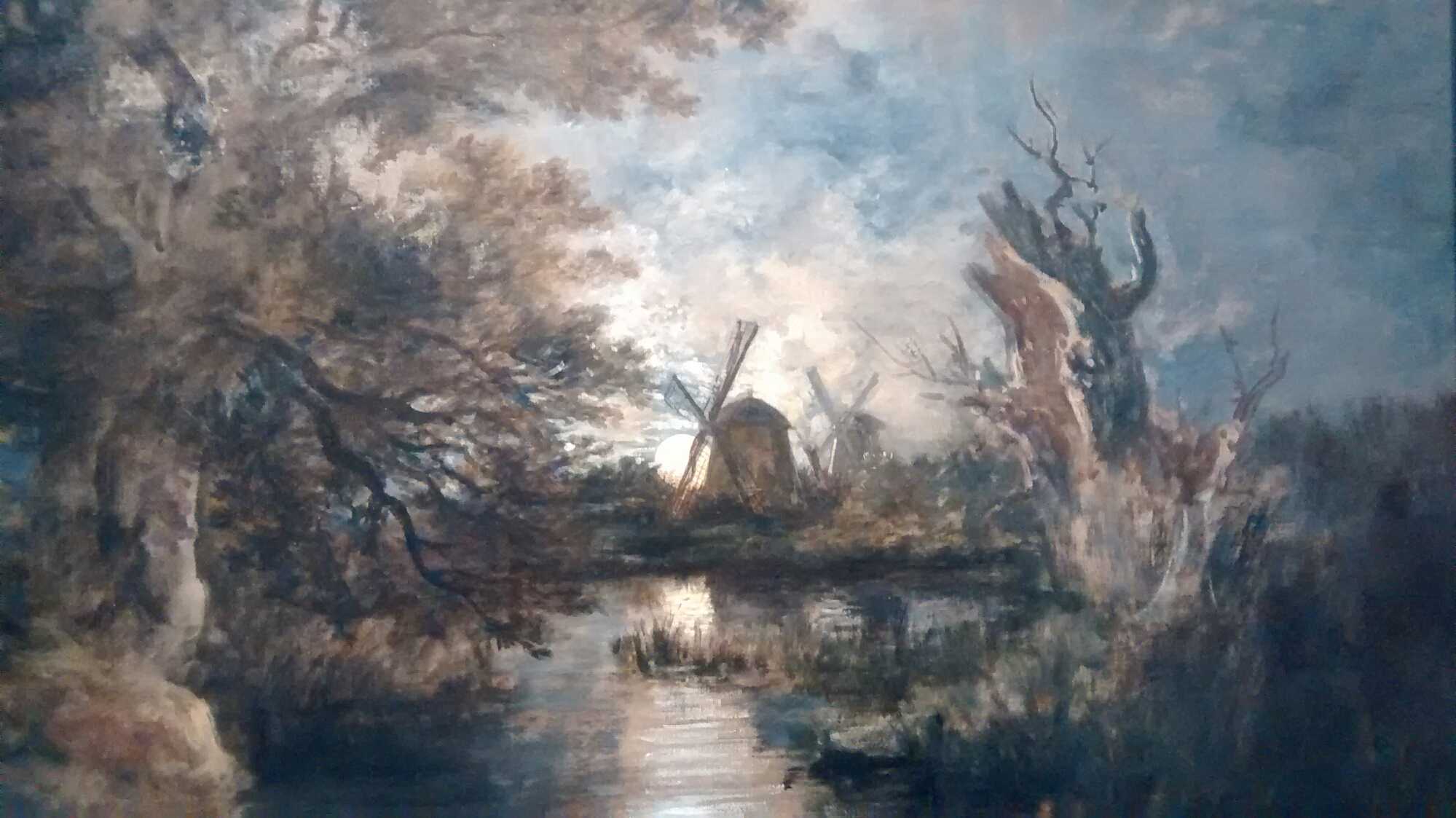 Hubo otro cuadro de un molino que también llamó mucho mi atención: Moonlight on the Yare de John Crome. En este cuadro estaba la luna, mi siempre amada luna. Me vi recostada junto al árbol grande, hipnotizada por la luz de la luna que se refleja en el agua. Estaba demasiado cansada para llegar a los molinos pero feliz de poder admirarlos.