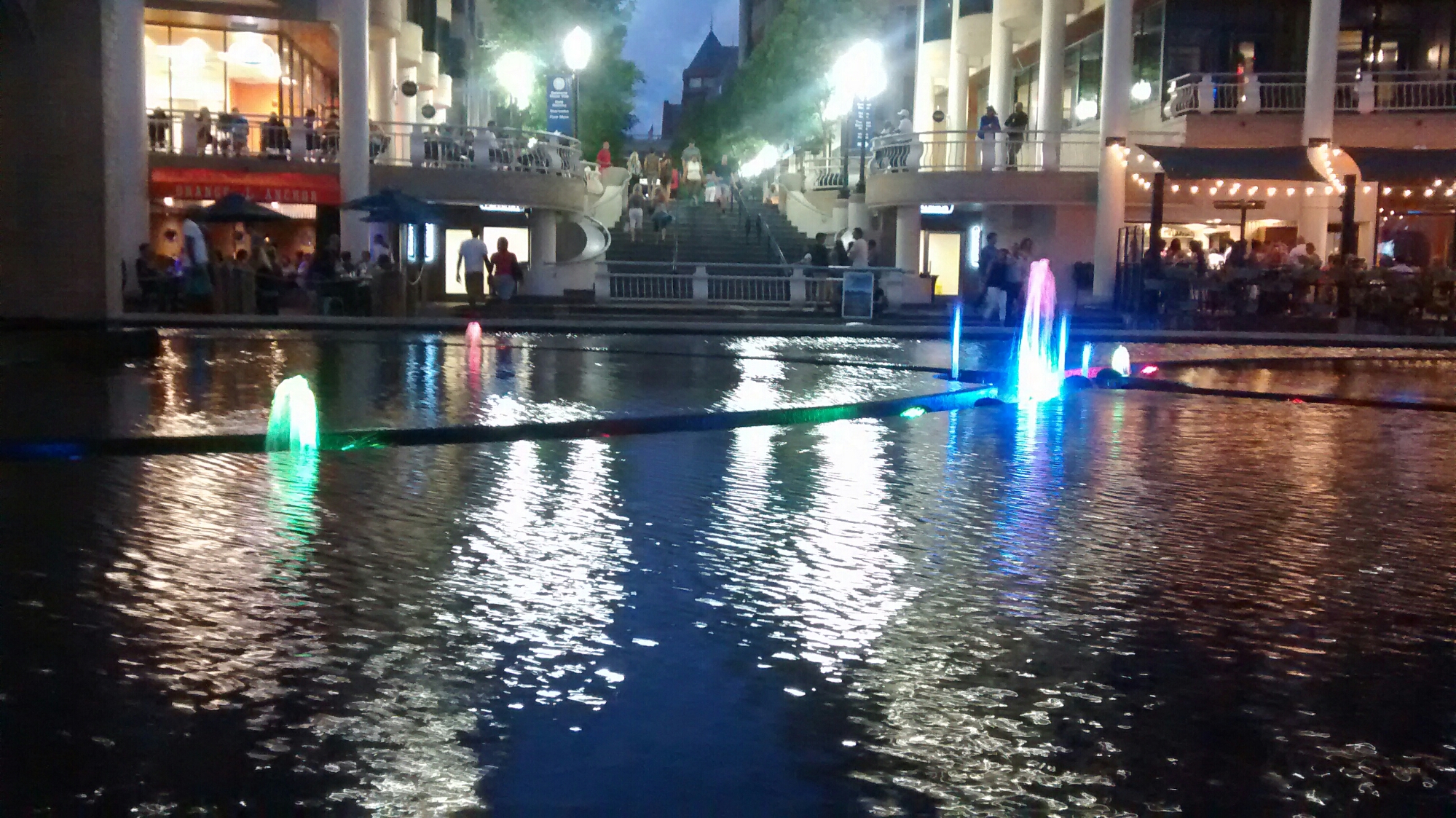 Me entretuve viendo las luces de colores en la «fuente» de la plaza por la que caminábamos.