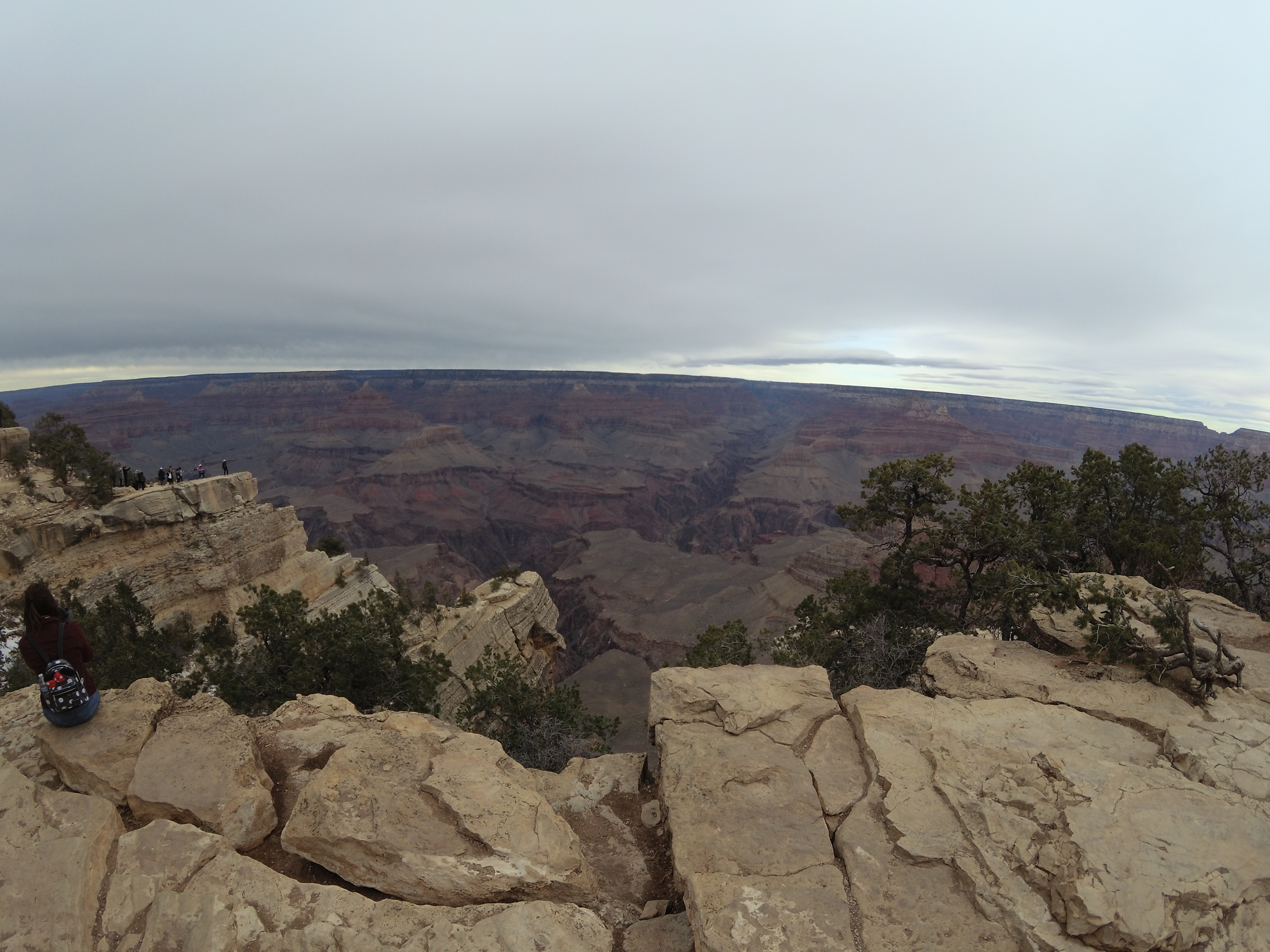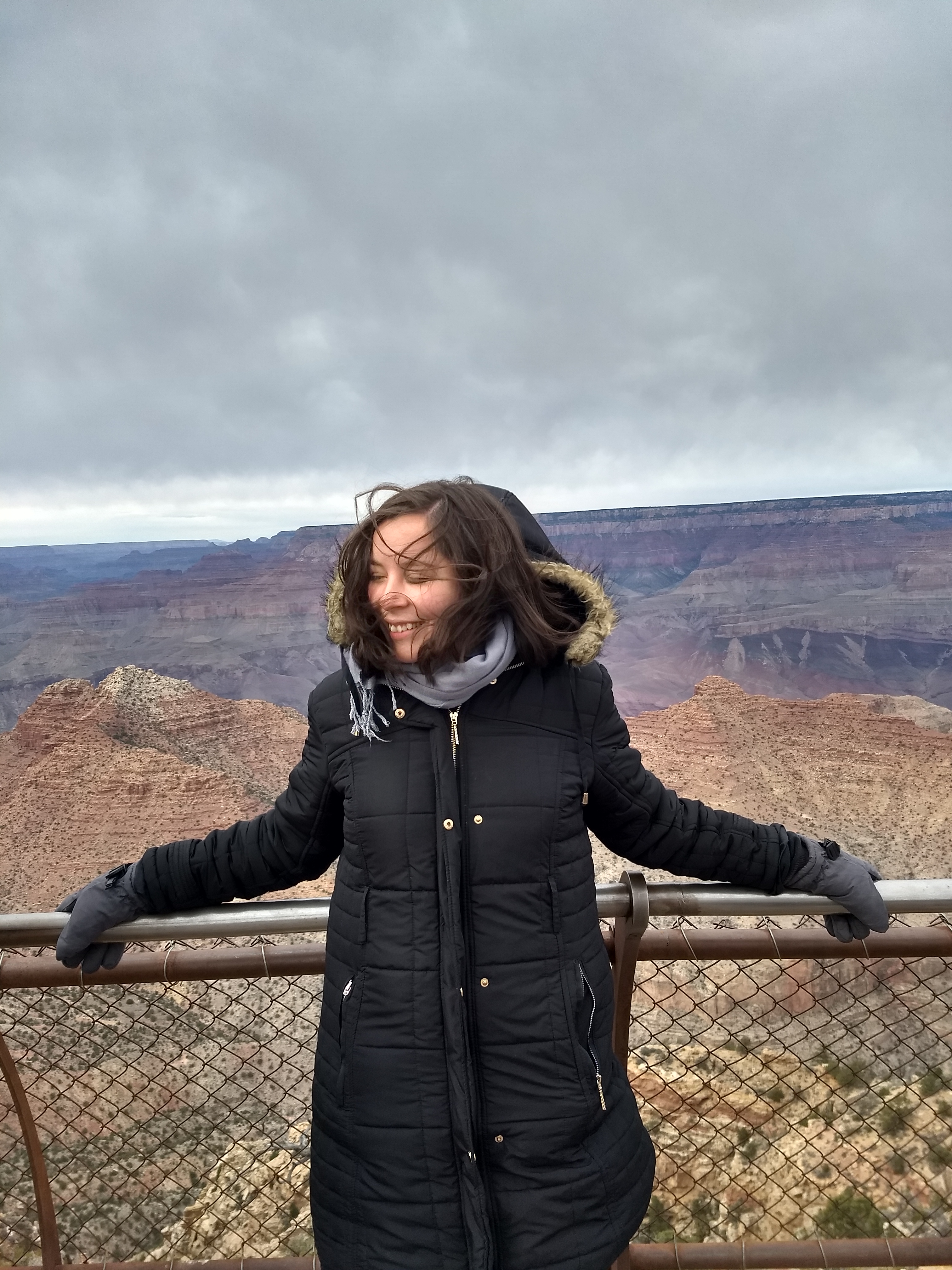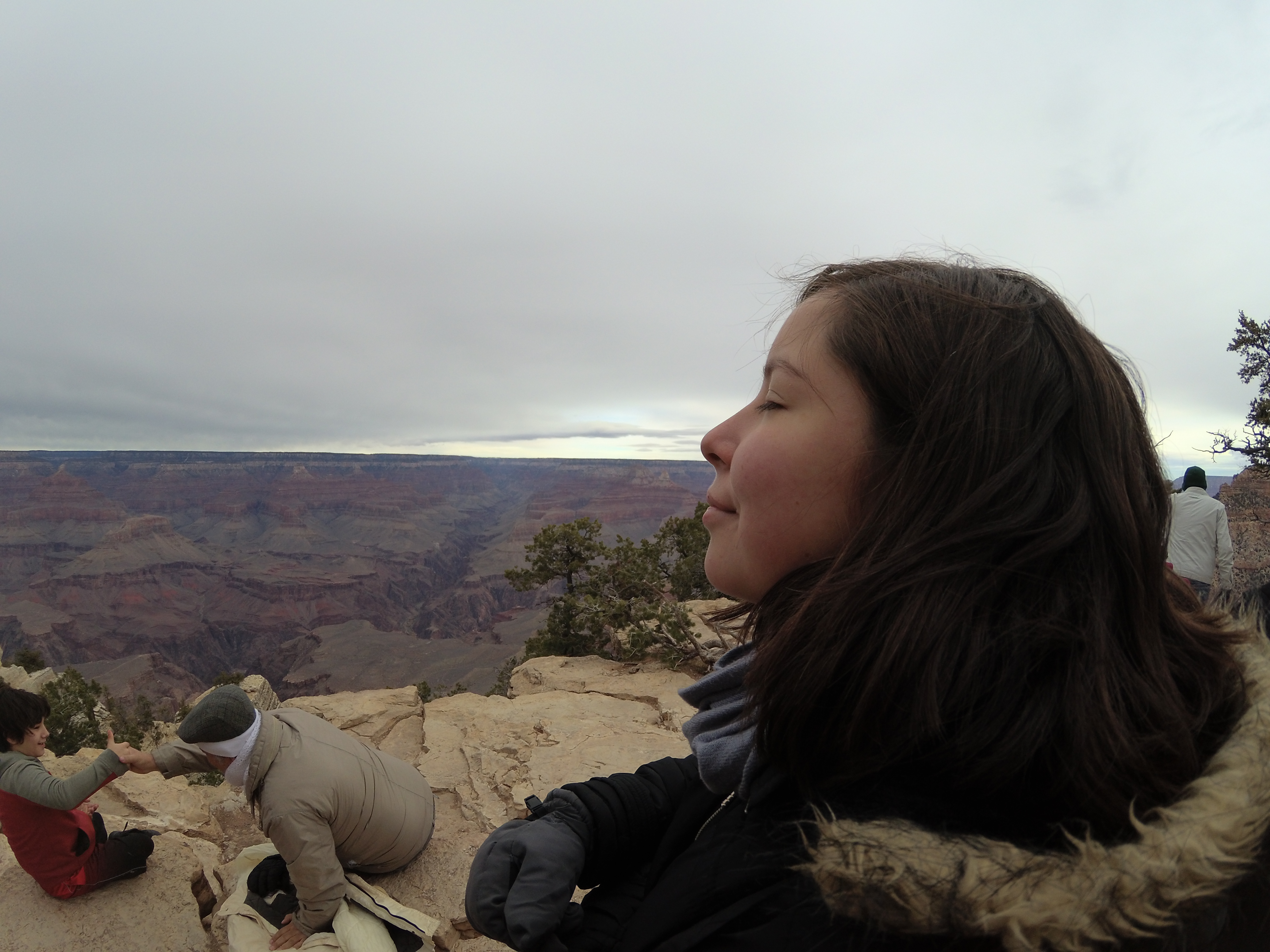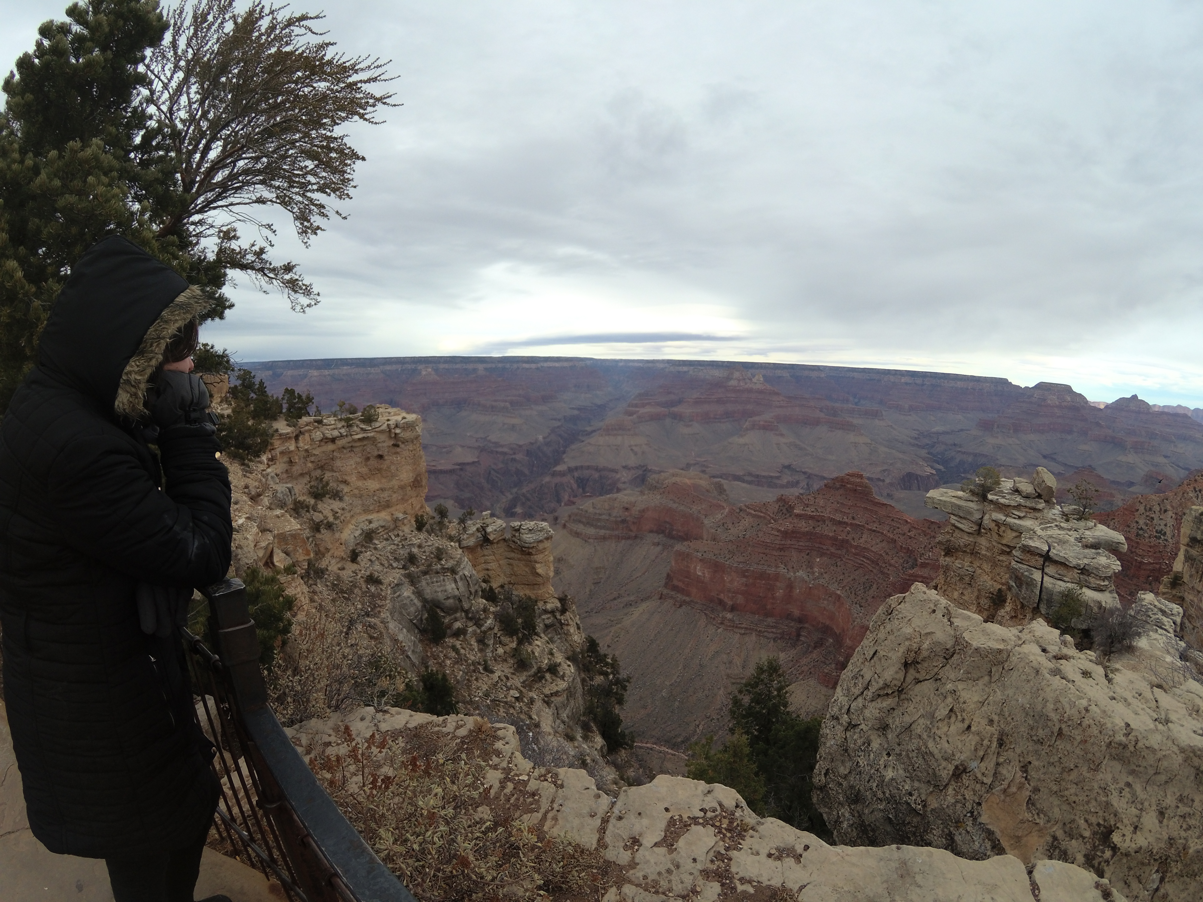 No caminamos mucho para encontrarnos frente a frente con el Gran Cañón. ¿Qué puedo contarles? Que me resultó imposible fotografiarlo todo, que las palabras no me alcanzan para describirlo, que me sentí muy pequeña y, a la vez, llena de admiración por la naturaleza, que el viento, a pesar del frío, me conmovía y me recordaba lo efímera y grandiosa que es la vida.