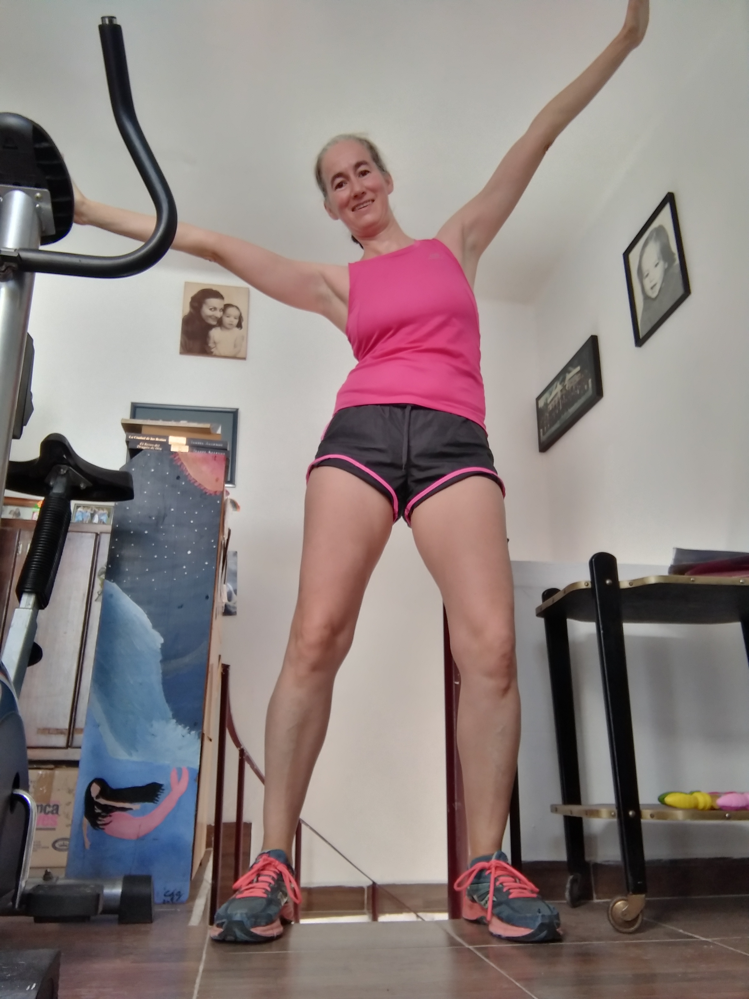 El triatlón consistía en hacer diez minutos de ligas, veinte minutos de bicicleta y treinta minutos de saltar la cuerda, subir y bajar escaleras, hacer jumping jacks. Por supuesto, teníamos la posibilidad de hacerlo en vivo con nuestras atletas guías. Podría decirte mil cosas, pero lo importante es que me sentí en las nubes, agradecida por conocer (aunque sea de manera virtual) a personas tan solidarias y cálidas, por tener la oportunidad de hacer algo extraordinario en mi propia casa.
